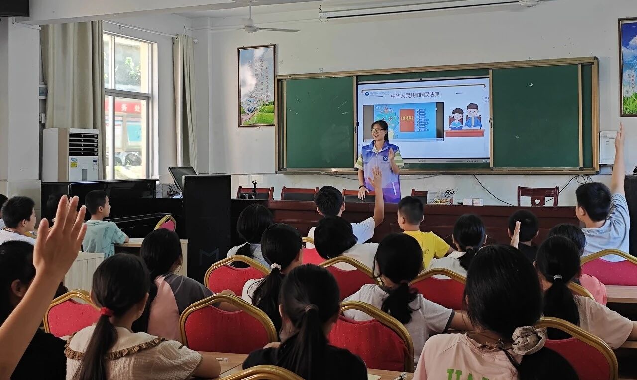 在欧阳修小学,普法宣传先行。志愿者围绕“民法如何保护你我一生”话题展开,从胎儿时期的权益保障,讲到成年后民事行为能力、婚姻家庭、财产保护等内容。用“小军” 的成长故事串起民法知识,小军在妈妈腹中时就受民法保护到八周岁后买文具、接受赠与等行为的法律效力,以及遭遇侵权时如何维权。通过这些贴近孩子生活的案例,把民法知识变得好懂好记,让法治种子在孩子们心里扎根。 紧接着的推广普通话课堂,满是活力。志愿者带着趣味绕口令让孩子们在诵读中纠正发音;开展方言变普通话挑战,鼓励大家用普通话讲家乡事儿。在欢声笑语里,孩子们学说普通话更积极,也让普通话成为连接乡村与外界的文化纽带。